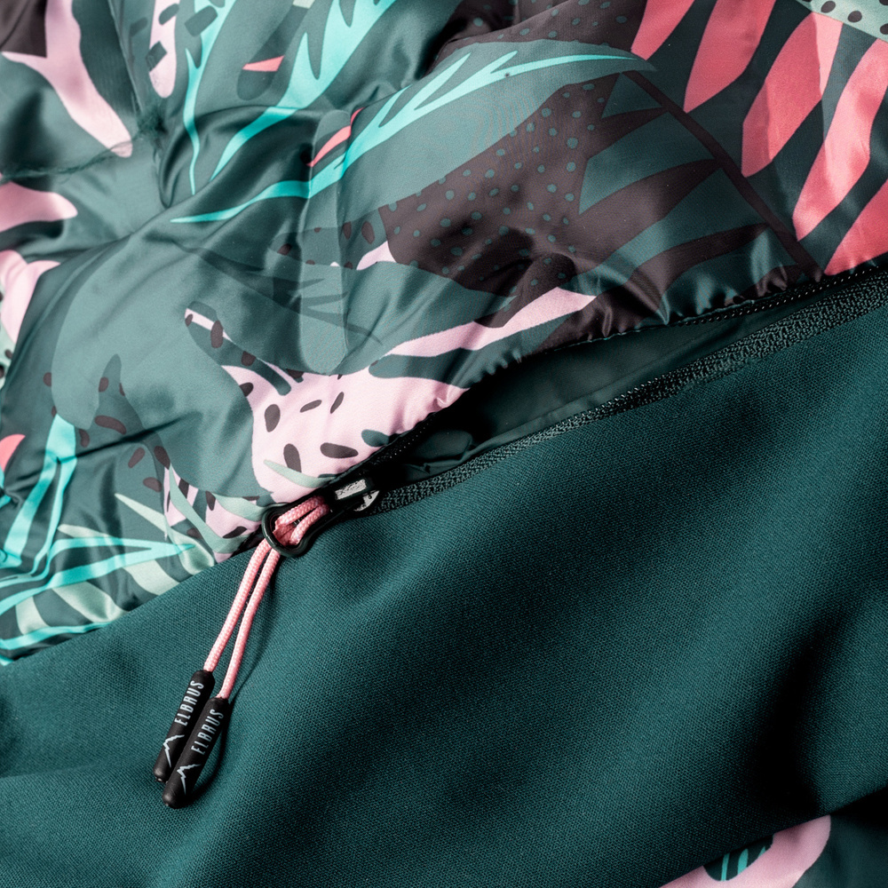 Zintegrowany kaptur również posiada wypełnienie, a elastyczna lamówka pozwala lepiej dopasować kaptur, który ochroni dzieci przed powiewami wiatru i lekkim deszczem.