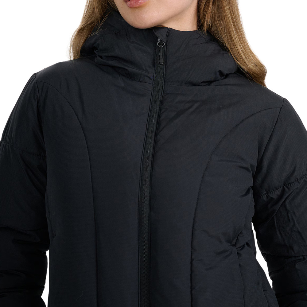 Nieodpinany kaptur bez regulacji osłania głowę przed opadami, a kołnierz osłania wrażliwą szyję przed podmuchami chłodnego powietrza.