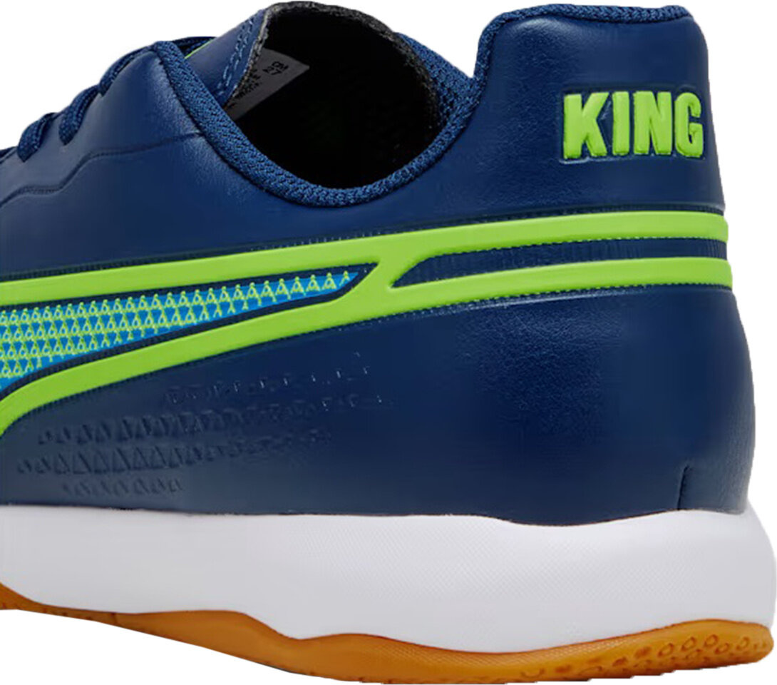 Buty piłkarskie męskie Puma King pozwolą Ci osiągnąć lepszą przyczepność i szybkość reakcji podczas treningów odbywających się na halach sportowych. Warstwę wierzchnią cholewki tworzy miękka mikrofibra wykonana z materiału pochodzącego z recyklingu, co znacznie zmniejsza negatywny wpływ na środowisko, jednocześnie poprawiając wrażenie dotyku, komfort i odporność na rozciąganie. Klasyczne sznurowanie gwarantuje optymalne dopasowanie i komfort, a świetne czucie piłki zapewni tłoczona struktura w kluczowych obszarach kontaktu. Niebrudząca, gumowa podeszwa zewnętrzna zadba o jak najlepszą przyczepność podczas zwrotnych akcji.