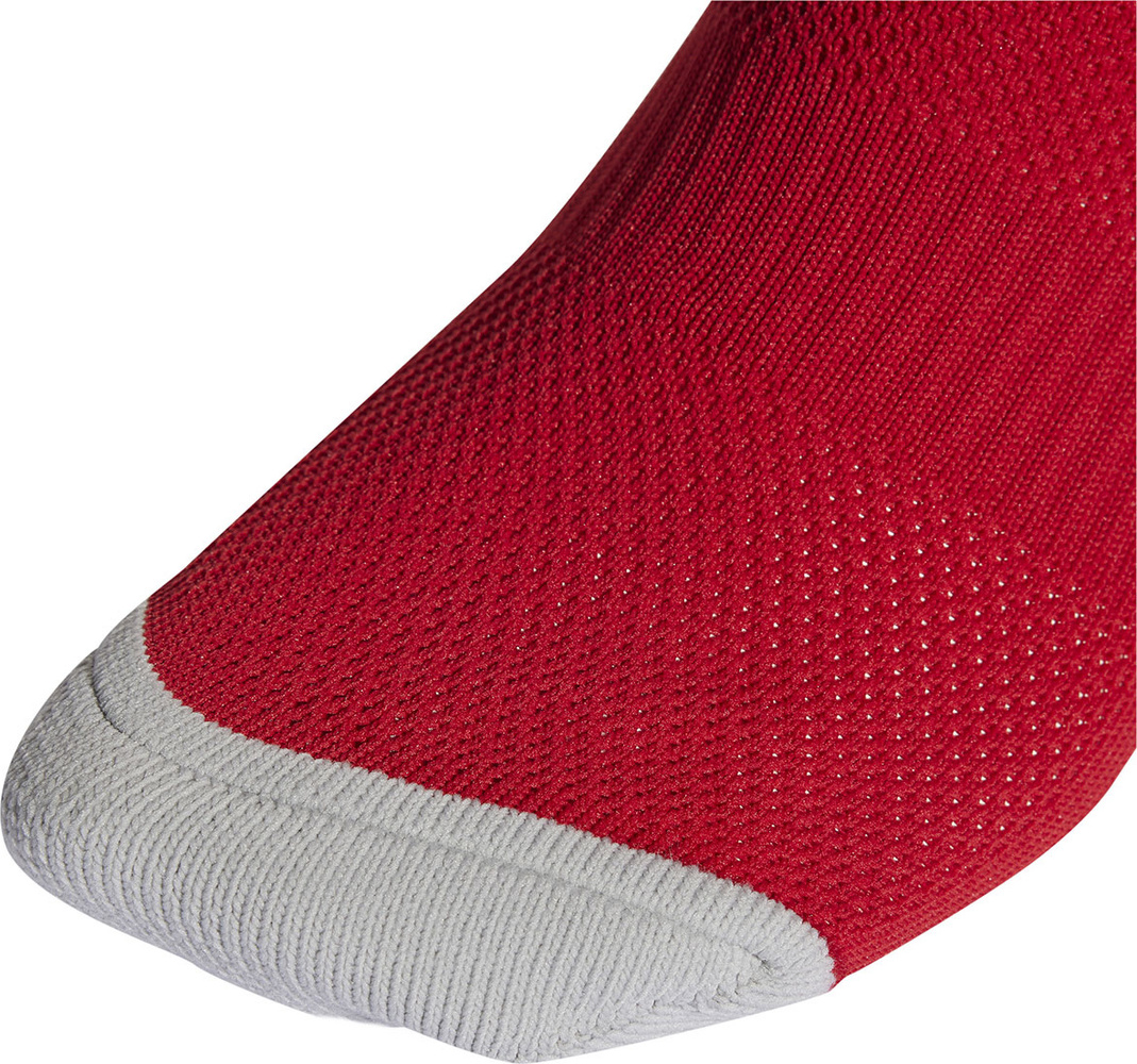 Czerwone getry z szarymi detalami oraz subtelnym logo adidas na przodzie tworzą uniwersalny design, który z łatwością dopasujesz do swojego piłkarskiego kompletu.