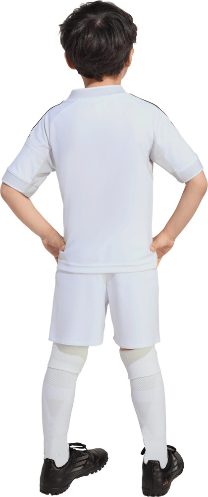 Komplet sportowy dla dzieci adidas obejmujący spodenki, koszulkę i getry nie pozostawia wątpliwości co do piłkarskiej pasji płonącej w młodym sercu.