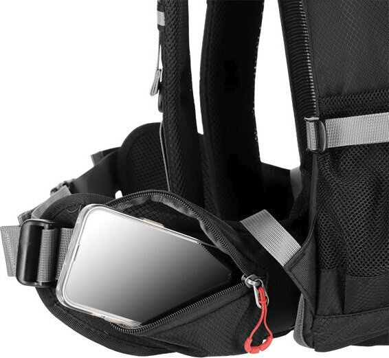Plecak posiada również dwie kieszenie boczne z siatki oraz kieszenie na zamek w pasie biodrowym, idealne na telefon czy inne drobne przedmioty.