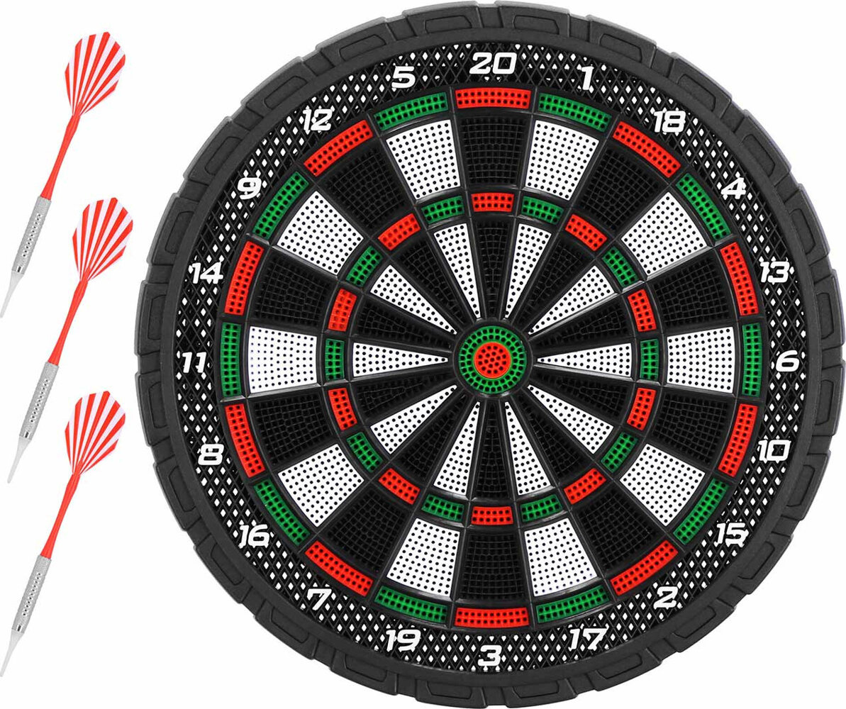 Wygrywa osoba, która jako pierwsza osiągnie wybraną liczbę punktów (najczęściej 301 lub 501). Dane techniczne:· Materiał: PP· Tarczę można zwiesić lub postawić na stojaku· W zestawie: 3 lotki z plastikową końcówką, dodatkowe końcówki· Certyfikat: CE