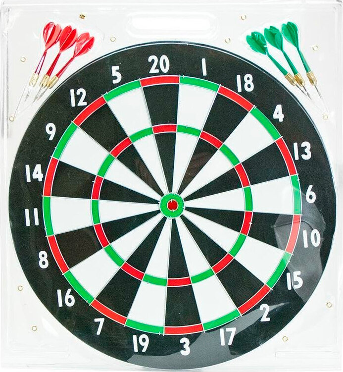 Wysokiej jakości dwustronna tarcza do darta, idealna dla średnio zaawansowanych i początkujących zawodników. Zawartość opakowania to tarcza wykonana z papieru (o wymiarach 15" x 1/2") z drucianym pająkiem oraz zestawem sześciu rzutek typu STEELTIP (stalowy grot) o wadze 8g. Tarcza posiada uchwyt do zawieszenia.