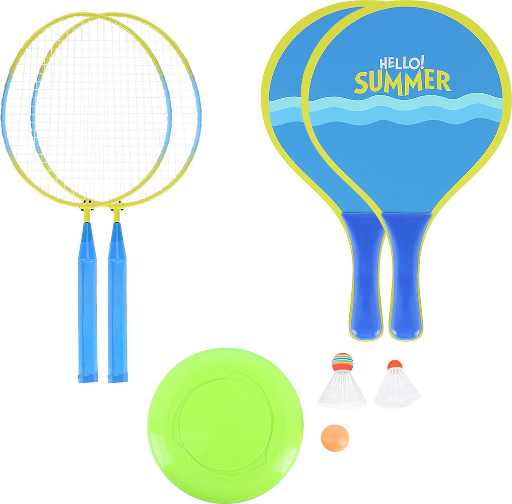 W skład zestawu, wchodzą dwie stalowe rakietki, dwie drewniane rakietki, dwie lotki, gumowa piłeczka, a jakby tego było mało, frisbee.