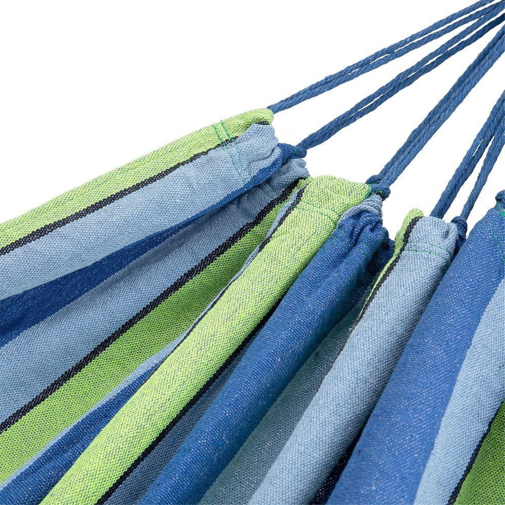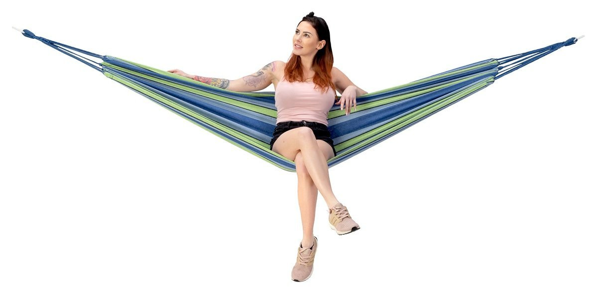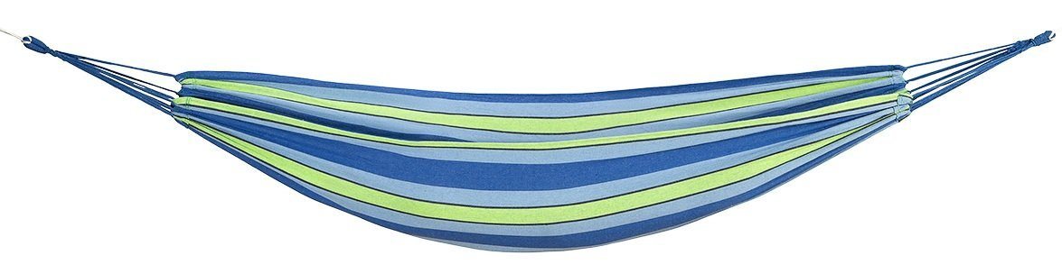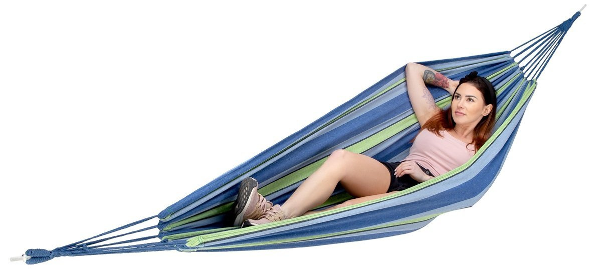 To hamak, przeznaczony do zawieszenia np. między dwoma drzewami. Łatwy w montażu, wszystkie niezbędne przybory, znajdują się w zestawie. Już po kilku chwilach, będziemy mogli oddać się, błogiemu odpoczynkowi. Hamak idealnie dopasuje się naszego ciała, a szerokość aż 120 cm gwarantuje każdemu, znalezienie wygodnej pozycji. Materiał hamaka to poliester oraz przyjemna, gęsto pleciona bawełna. Takie połączenie, daje bardzo wysoką wytrzymałość oraz odporność, na jakiekolwiek odkształcenie.