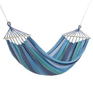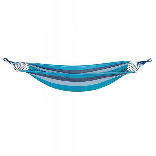 To hamak, przeznaczony do zawieszenia np. między dwoma drzewami. Łatwy w montażu, wszystkie niezbędne przybory, znajdują się w zestawie. Już po kilku chwilach, będziemy mogli oddać się, błogiemu odpoczynkowi. Drewniana belka o długości 70 cm, umieszczona w hamaku jako wzmocnienie sprawia, że materiał nie będzie się naciągał, przez co jego sprężystość będzie cały czas na takim samym, wysokim poziomie. Dzięki temu, będziemy odczuwali komfort użytkowania, przez wiele sezonów. Hamak idealnie dopasuje się naszego ciała, a szerokość aż 150 cm gwarantuje każdemu, znalezienie wygodnej pozycji. Materiał hamaka, to poliester oraz przyjemna, gęsto pleciona bawełna. Takie połączenie, daje bardzo wysoką wytrzymałość oraz odporność, na jakiekolwiek odkształcenie.