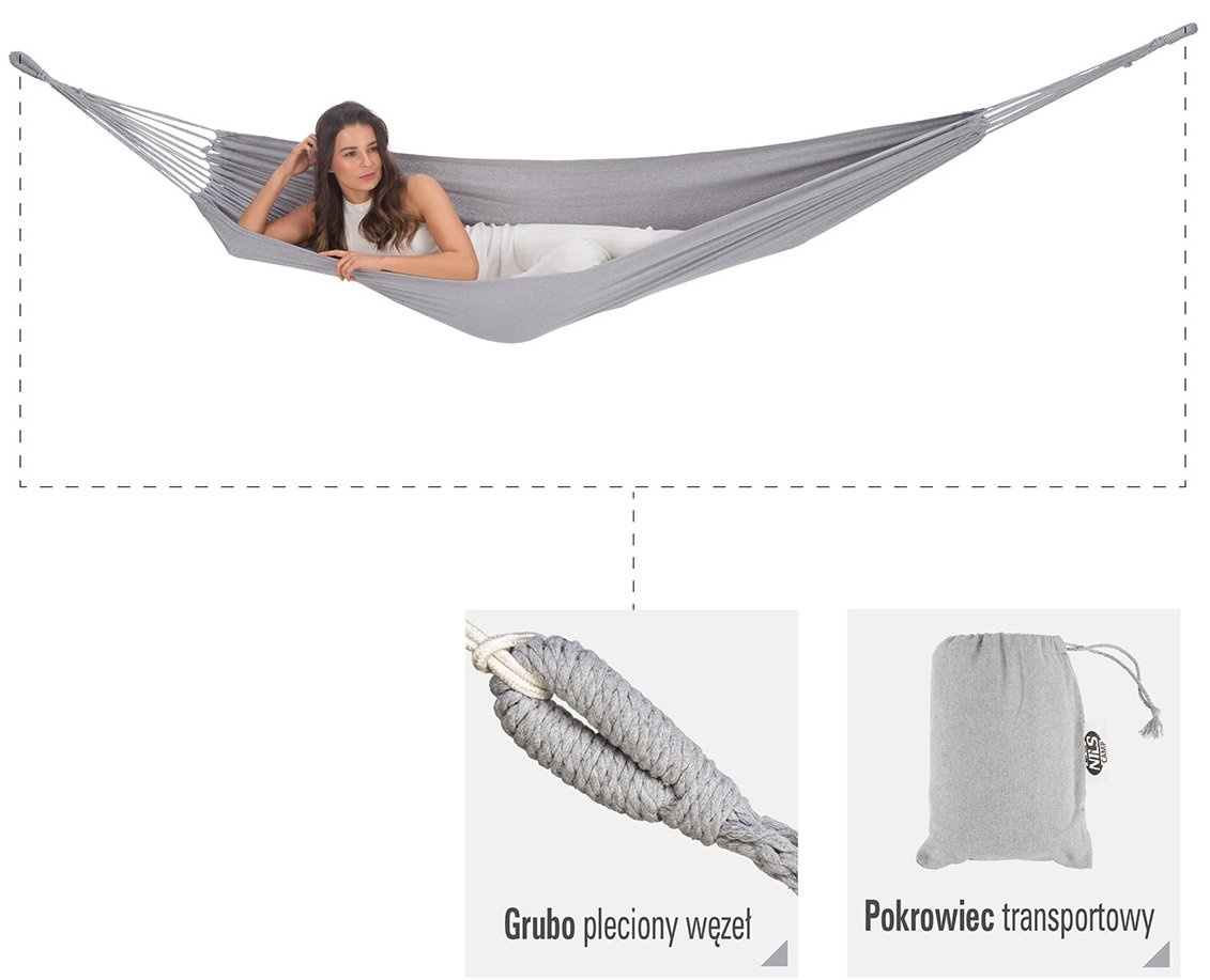 Montaż i demontaż jest bardzo prosty. Hamak jest przeznaczony do powieszenia między drzewami lub na stelażu. Po złożeniu produkt nie zajmuje dużo miejsca, a pokrowiec który znajduje się w zestawie ułatwi nam transport i pozwoli łatwo zabrać go ze sobą w każdą podróż.
