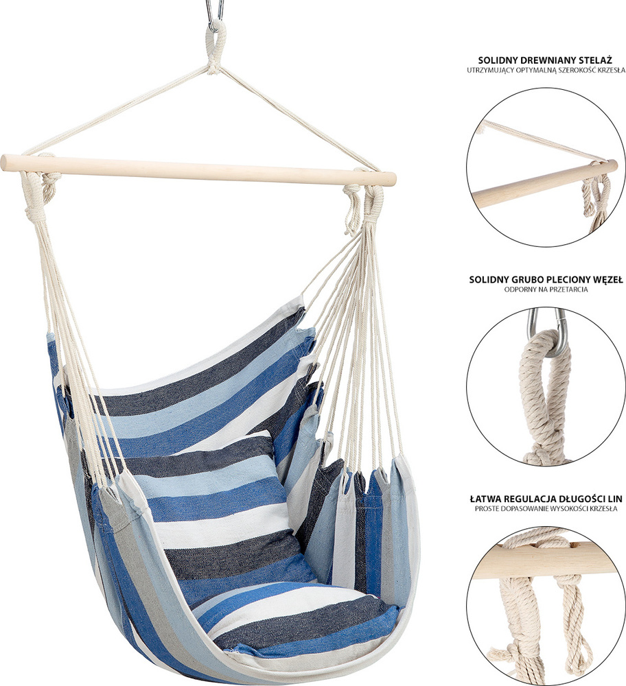 W połączeniu, z grubo plecionymi, mocnymi linami, solidnym drewnianym stelażem oraz metalowym uchwytem, otrzymujemy maksymalne dopuszczalne obciążenie, na poziomie 100 kg.