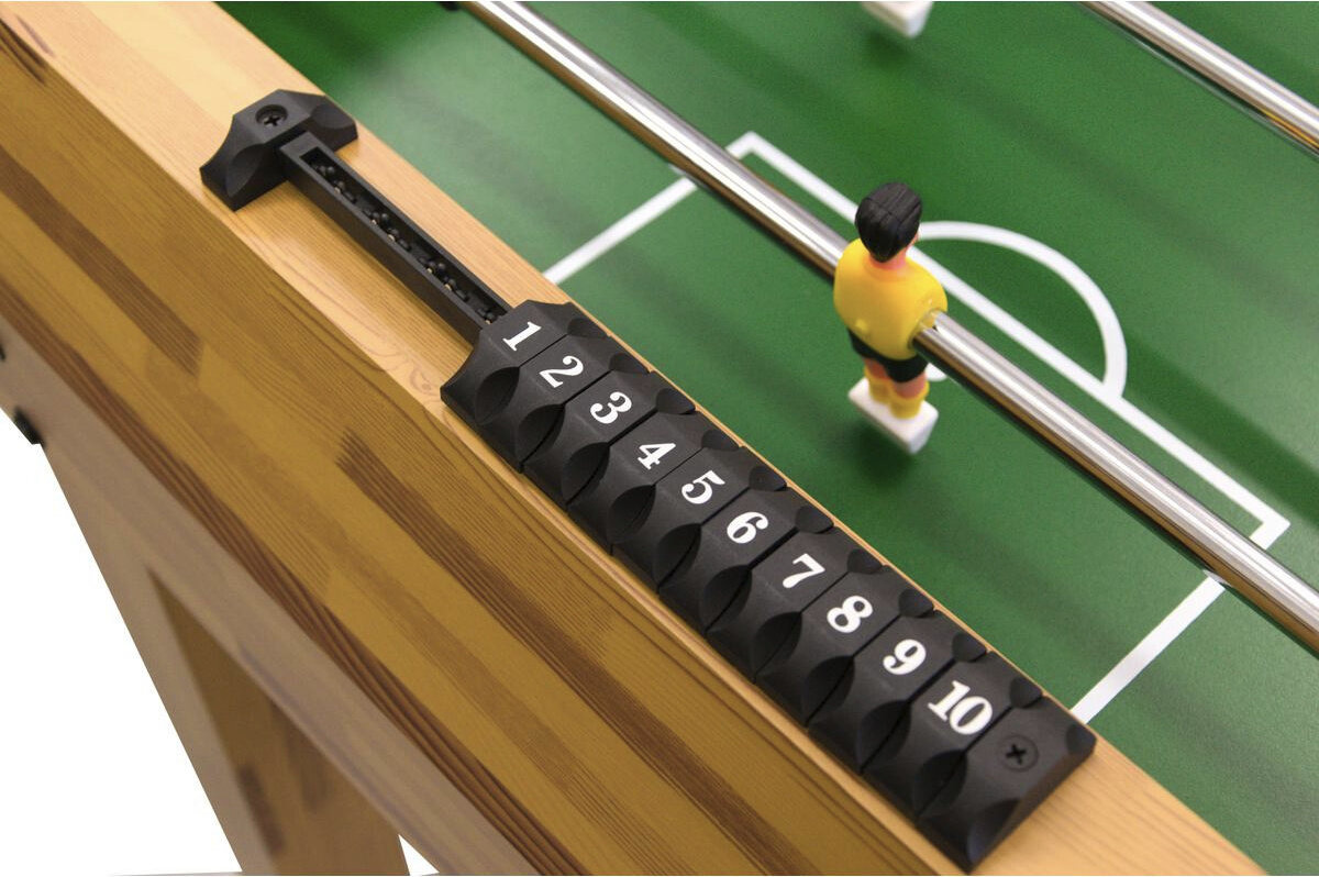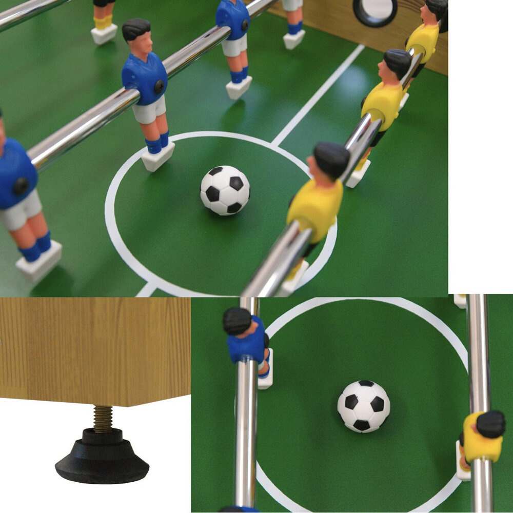 Stół został wyposażony w stalowe prowadnice z piłkarzykami i stoperami dla lepszej i bezpiecznej gry, w otwory do wrzucania piłek i w dwie bramki z wylotami po obu stronach oraz w 2 zapasowe piłeczki do gry.