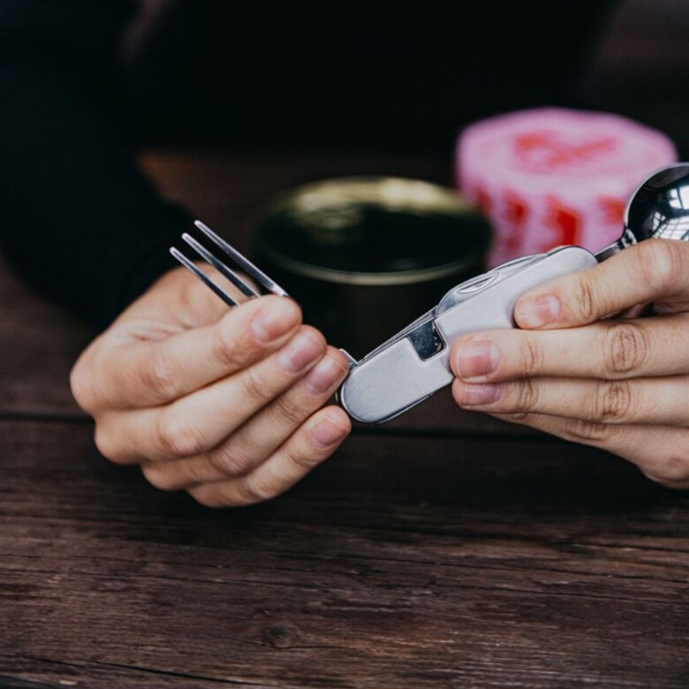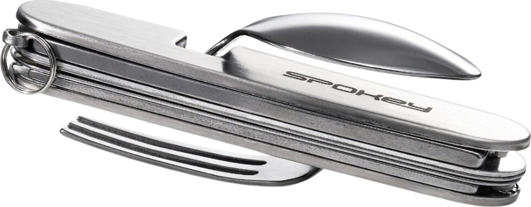 Multitool zawiera w sobie wszystkie najpotrzebniejsze elementy: łyżkę, widelec, nóż, otwieracz.