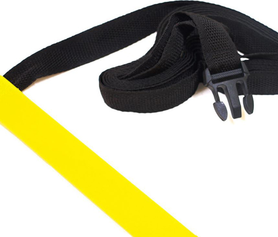Drabinka koordynacyjna wykonana z mocnego żółtego tworzywa PCV (szczebelki) oraz taśmy polietylenowej w kolorze czarnym to idealne narzędzie do zestawiania różnych ćwiczeń rozwijających pracę nóg.