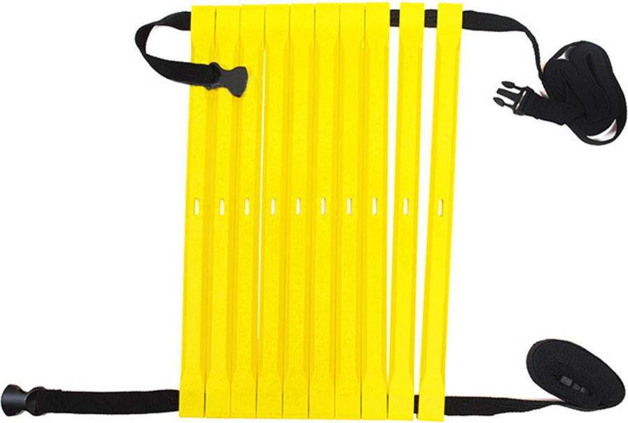 Drabinka koordynacyjna NO10 wykonana z mocnego żółtego tworzywa PCV (szczebelki) oraz taśmy polietylenowej w kolorze czarnym to idealne narzędzie do zestawiania różnych ćwiczeń rozwijających pracę nóg.
