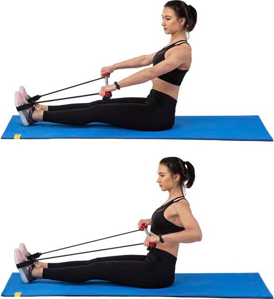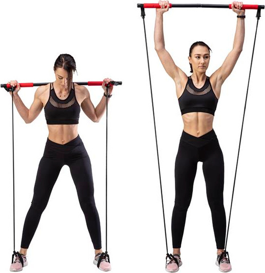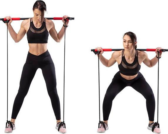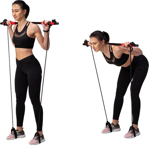 Ćwiczenia możemy wykonywać, przez założenie gum na stopy i wykonując ruchy drążkiem, bądź też na odwrót, przytrzymując drążek nogami i rozciągać gumy.
