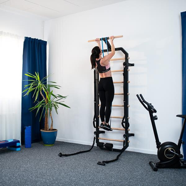 Drabina ma wysokość 223 cm i szerokość 80 cm, dzięki czemu każda osoba może na niej ćwiczyć.