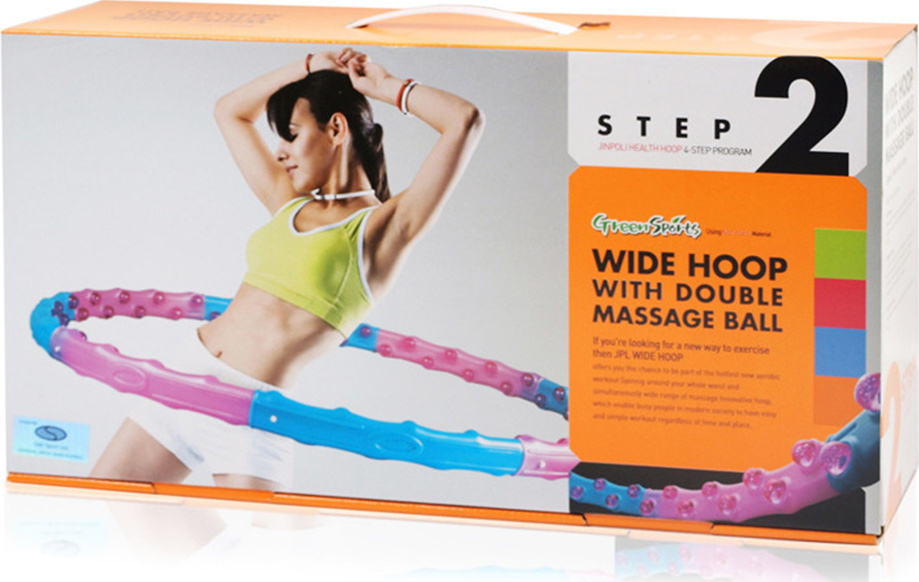 Spalanie kalorii na minutę:Wielkie koło hula hop powoduje spalanie większej liczby kalorii niż tradycyjne koła tego typu (osoby otyłe: 4,62 kcal/ min, osoby o normalnej tuszy: 4 kcal/min) Dane techniczne:Materiał: polistyren, polietylenŚrednica: 110 cmMasa: 1,25 kgZestaw do montażu : 8 części korpusu, 64 anionowych kulek masujących
