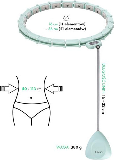 Rozmiar można ustawić w zakresie od 11 do 21 elementów, czyli obwód w talii od 50cm do 113cm (średnica pętli: 23cm do 43cm).
