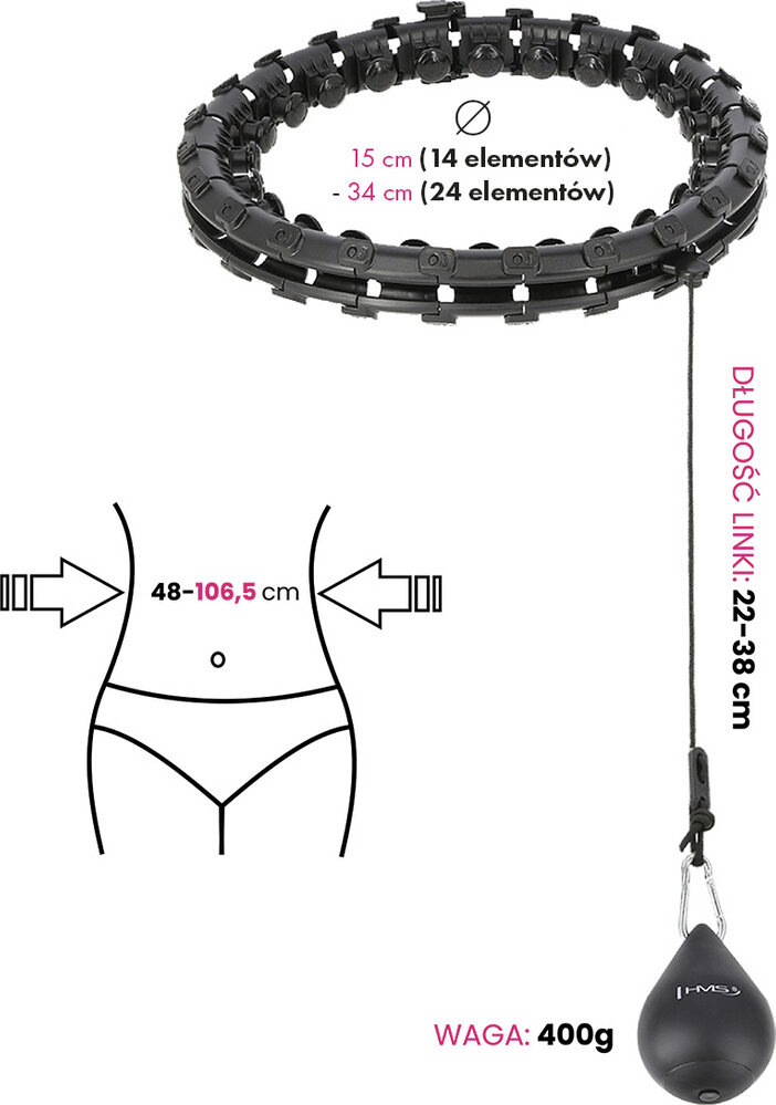HHW01 HMS to regulowany hula-hoop z absorbującymi drgania wypustkami i piłką grawitacyjną do fitnessu.