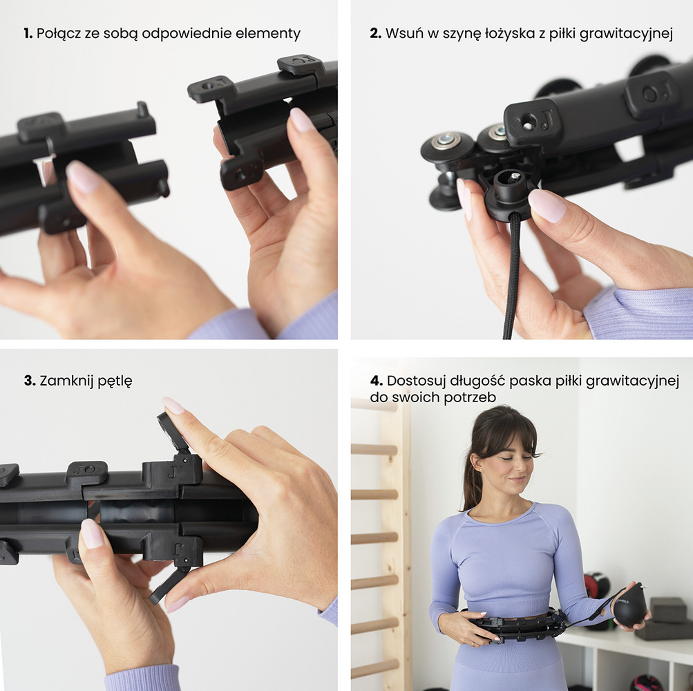 Następnie należy wsunąć do pętli szynę z piłką grawitacyjną, zamknąć klipsy na magnes, dostosować długość paska i gotowe.
