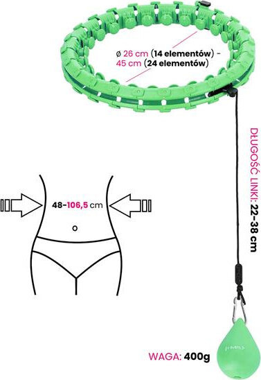 Rozmiar można ustawić w zakresie od 14 do 24 elementów, czyli obwód w talii od 48cm do 106,5cm (średnica pętli: 26cm do 45cm).