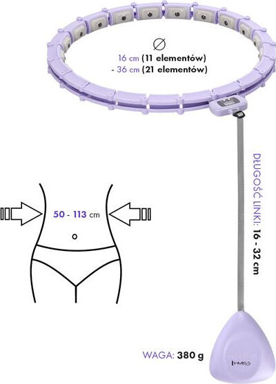 Rozmiar można ustawić w zakresie od 11 do 21 elementów, czyli obwód w talii od 50 cm do 113 cm (średnica pętli: 23 cm do 43 cm).