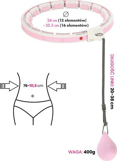 Rozmiar można ustawić w zakresie od 12 do 16 elementów, czyli obwód w talii od 76 cm - 111,5 cm (średnica pętli: 34 cm do 45 cm).