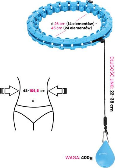 Rozmiar można ustawić w zakresie od 14 do 24 elementów, czyli obwód w talii od 48 cm do 106,5 cm (średnica pętli: 26 cm do 45 cm).