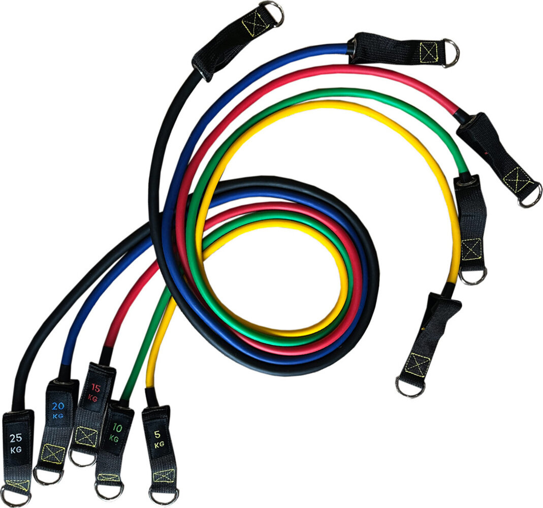 Całość można przenosić lub przechowywać w praktycznym woreczku. Zestaw obejmuje:a) 5 gum o rożnym zakresie oporu· żółta - 5 kg· zielona - 10· czerwona - 15· niebieska - 20· czarna - 25 kgb) 2 uchwyty na ręcec) 2 uchwyty na kostkęd) 1 uchwyt pod drzwie) pokrowiec Dane techniczne:· ilość gum: 5 szt· opór: 5, 10,1 5, 20, 25 kg· wymiar uchwytu do ręki: 19,5 x 13 cm· wymiar uchwytu do drzwi: 30 cm· wymiar uchwytu na nogi: 5 x 5-12 cm· waga zestawu 0,678 kg· waga w opakowaniu: 0,773 kg