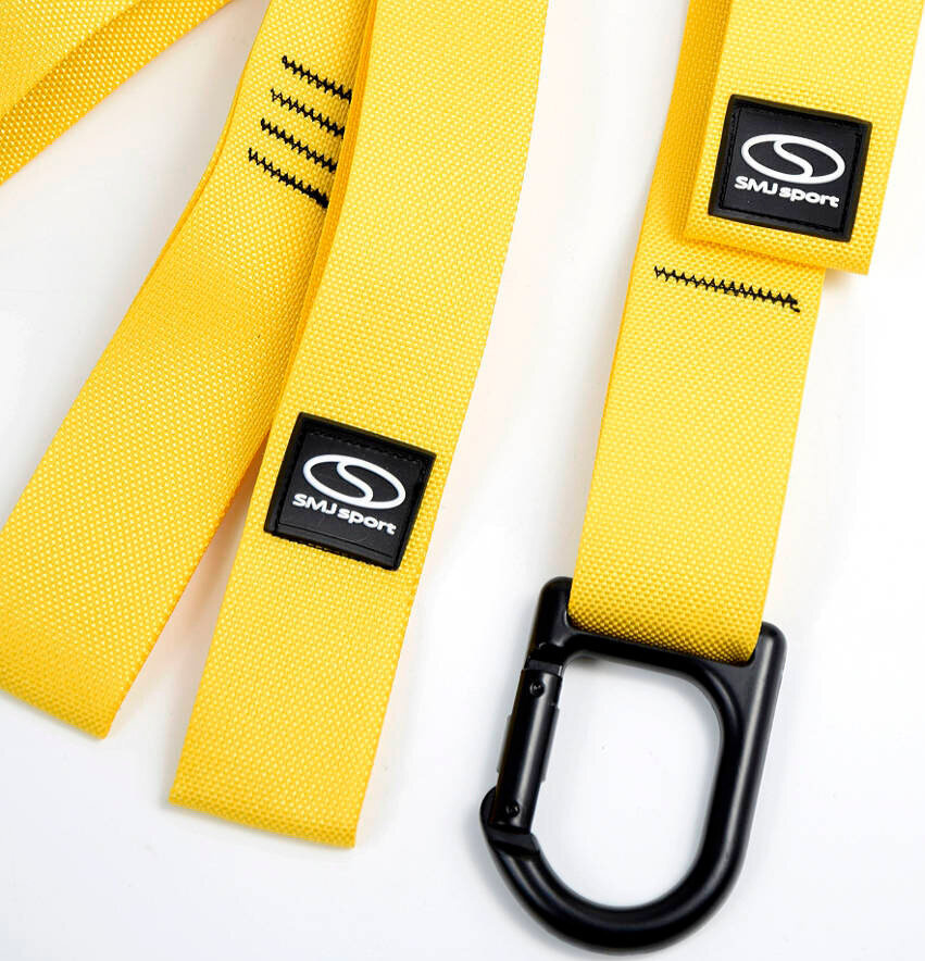 Taśma typu TRX marki SMJ sport to zestaw regulowanych taśm w kształcie litery Y, wykonanych z materiałów o najwyższej jakości, które można zawiesić np. na drzewie, drążku, a nawet na futrynie drzwi (za pomocą specjalnego bezpiecznego uchwytu)
