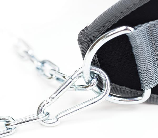 Stalowy łańcuch, który przymocowany jest do pasa, pozwala na zawieszenie obciążników.