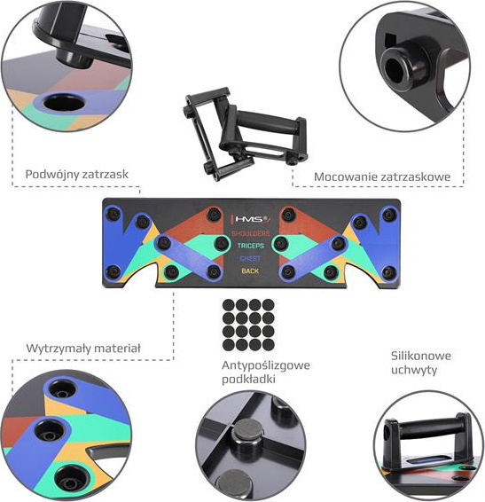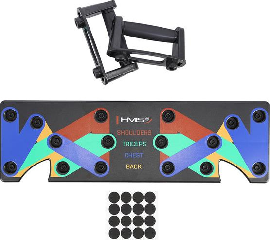 PU10 MULTI marki HMS, to innowacyjna i wielofunkcyjna deska, służąca do wykonywania ugięć ramion w podporze przodem, czyli tzw. pompek.