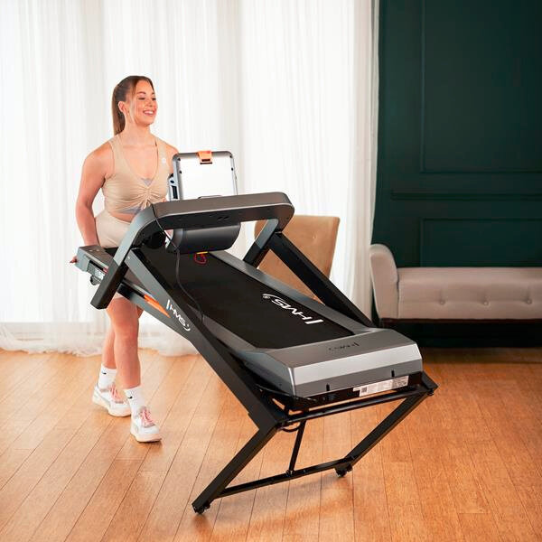 Składana konstrukcja pozwala na wygodne przechowywanie bieżni po zakończonym treningu, a kółka transportowe ułatwiają jej przestawianie.