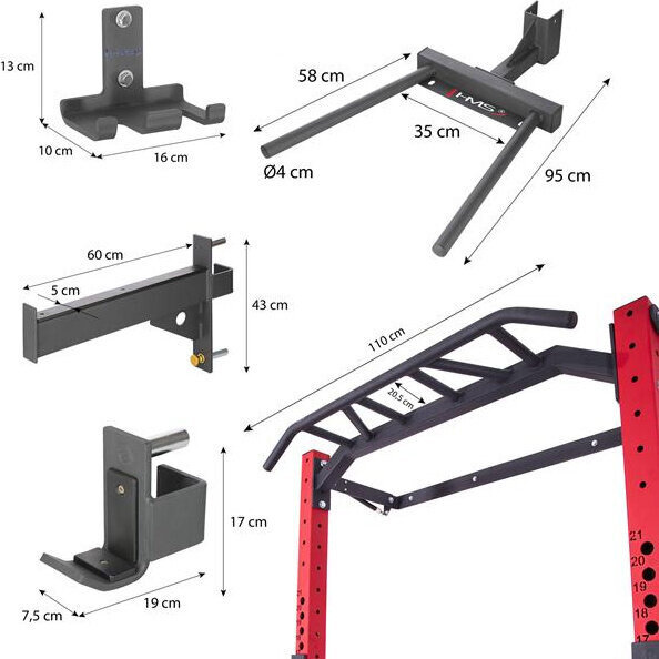 Oprócz drążka do podciągania, haków pod gryf i podpór bezpieczeństwa znajdziesz tam składaną ławkę płaską, poręcz do dipów, ścienny stojak na obciążenia oraz uchwyt na gryfy.