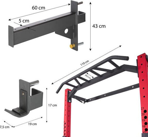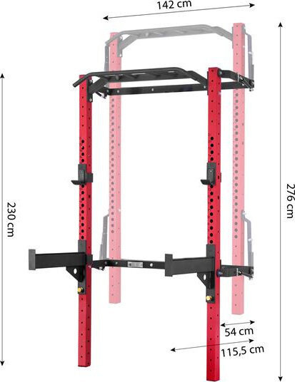 Klatka w tym wariancie jest sprzedawana z drążkiem do podciągania, hakami pod gryf oraz podporami bezpieczeństwa.