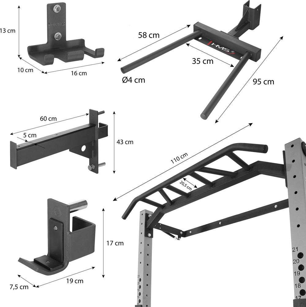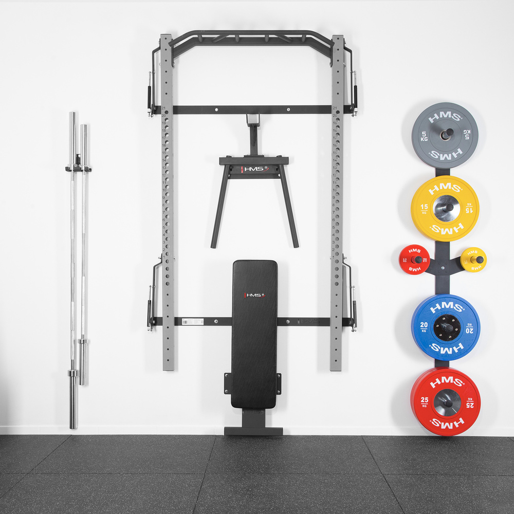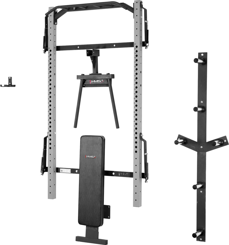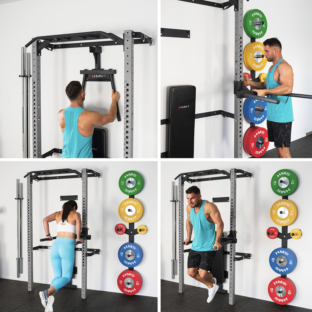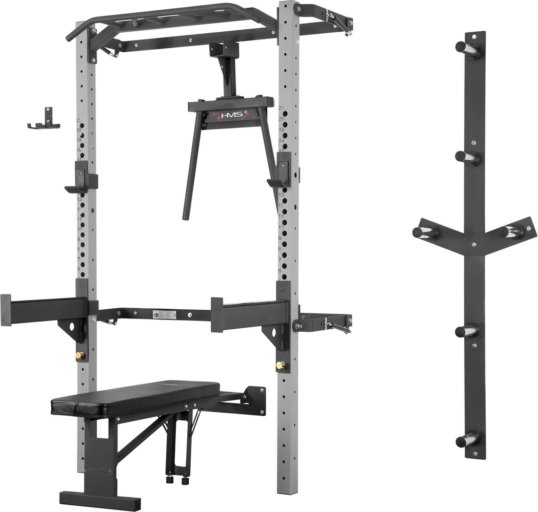 Oprócz drążka do podciągania, haków pod gryf i podpór bezpieczeństwa znajdziesz tam składaną ławkę płaską, poręcz do dipów, ścienny stojak na obciążenia oraz uchwyt na gryfy.