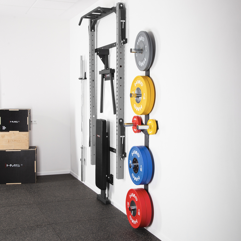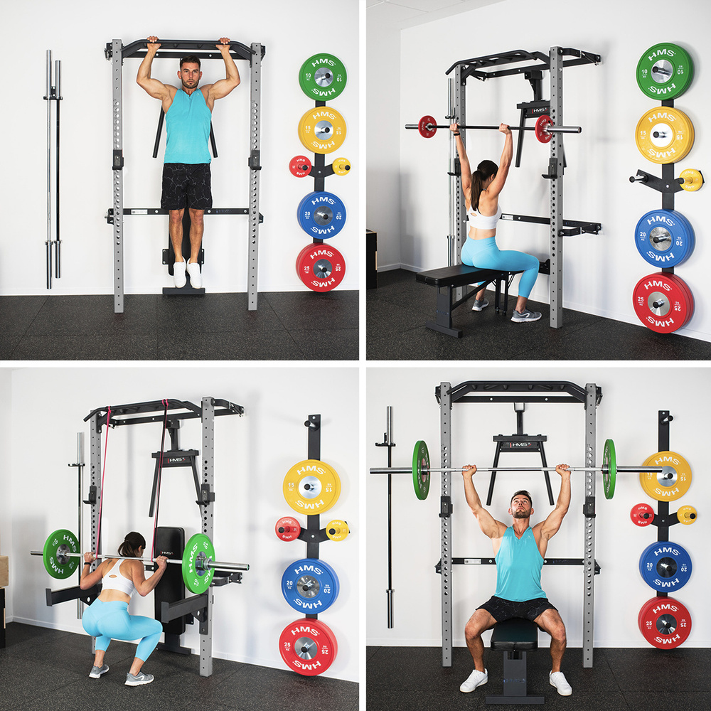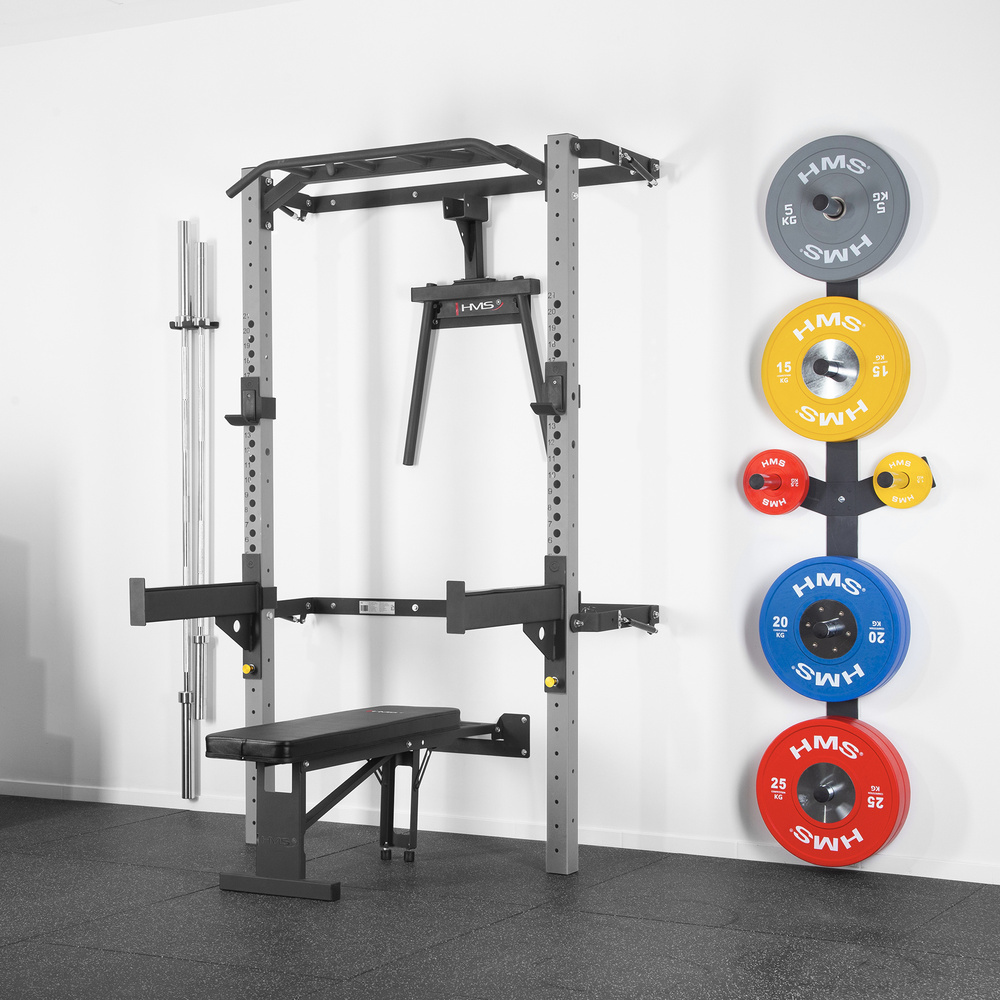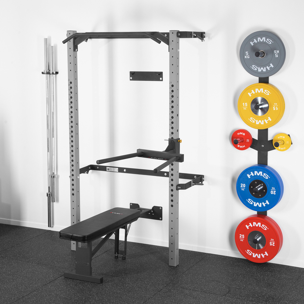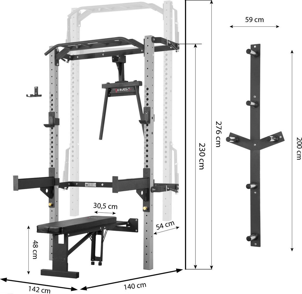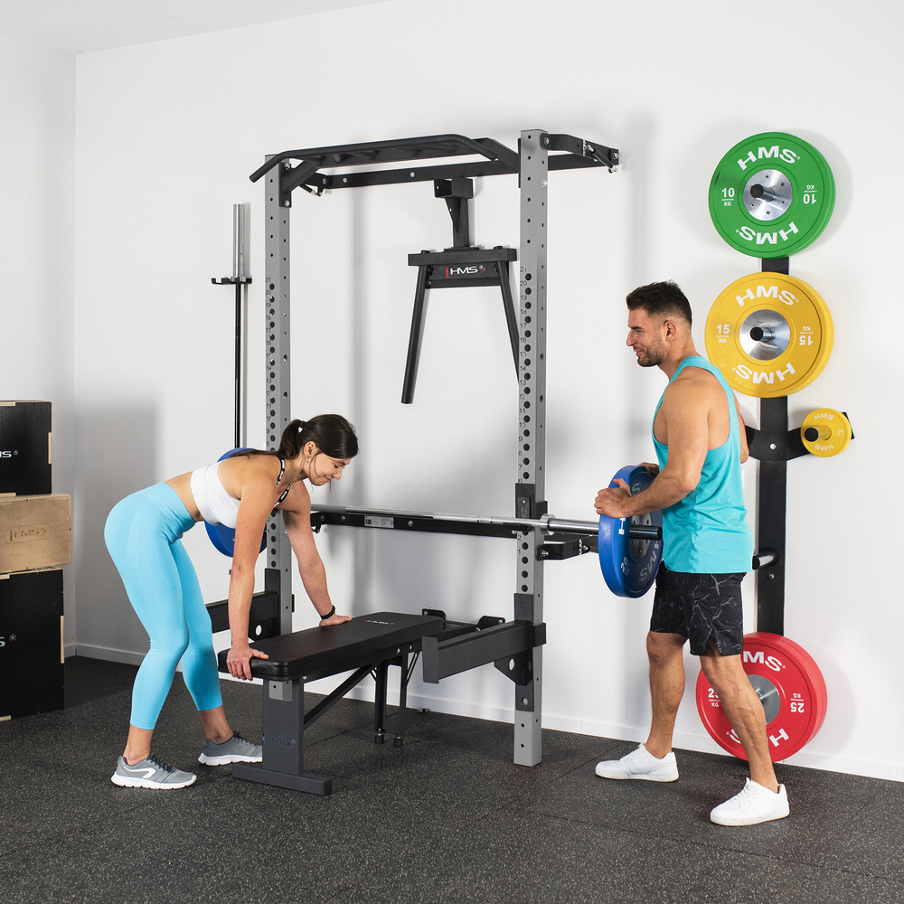 Oprócz drążka do podciągania, haków pod gryf i podpór bezpieczeństwa znajdziesz tam składaną ławkę płaską, poręcz do dipów, ścienny stojak na obciążenia oraz uchwyt na gryfy.