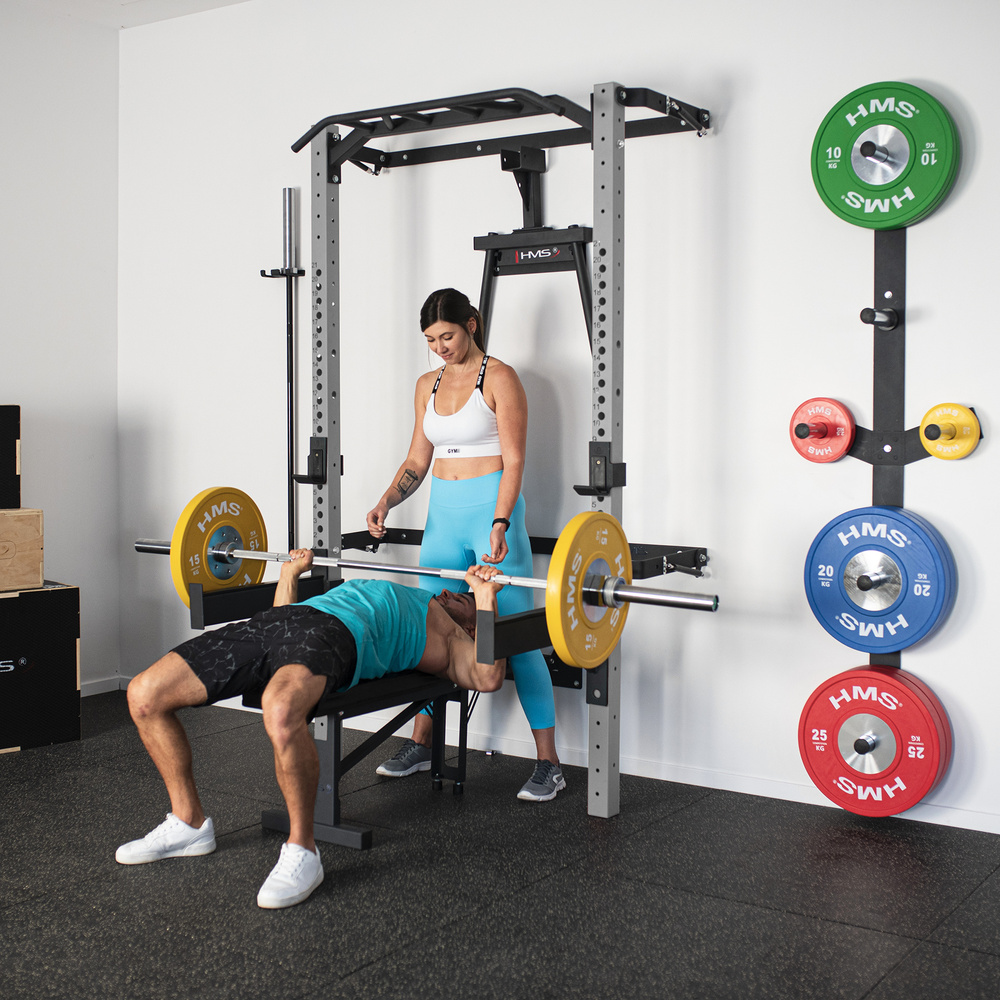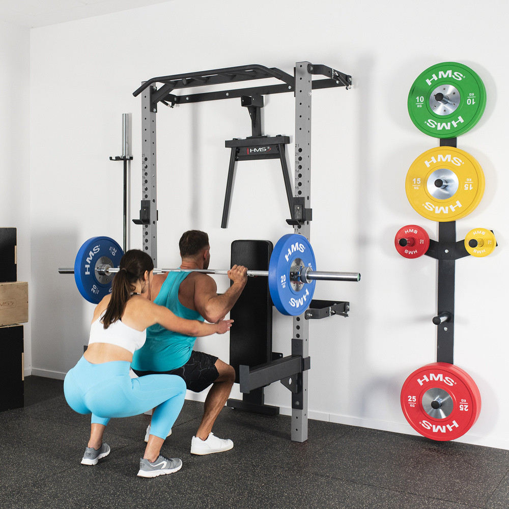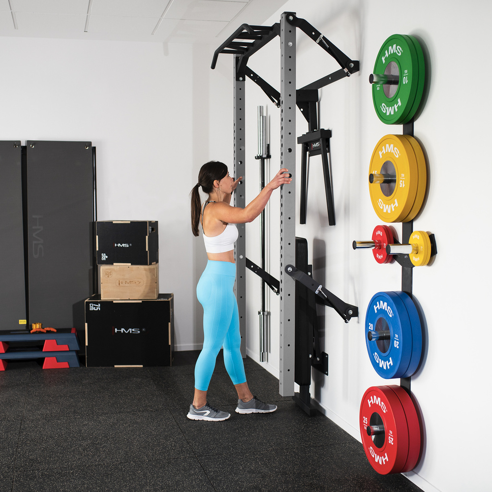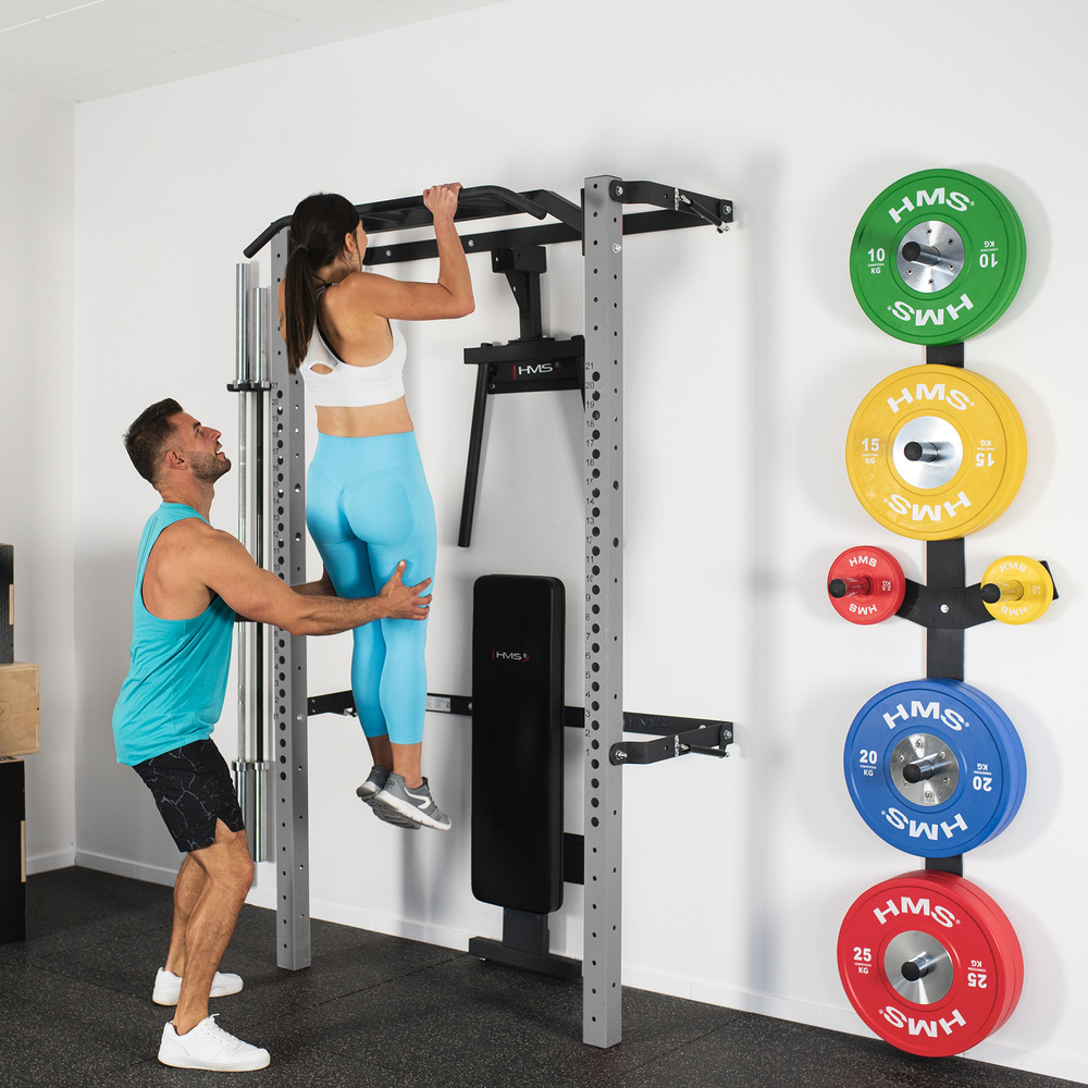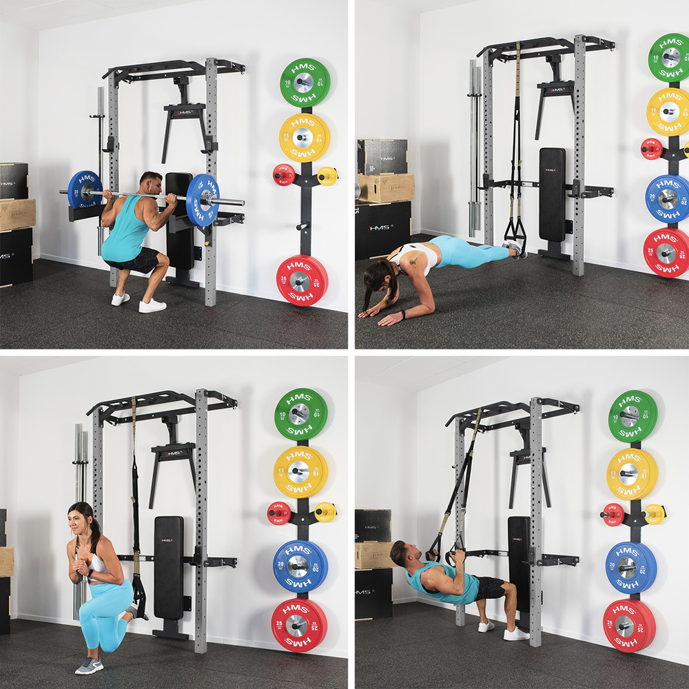 Oprócz drążka do podciągania, haków pod gryf i podpór bezpieczeństwa znajdziesz tam składaną ławkę płaską, poręcz do dipów, ścienny stojak na obciążenia oraz uchwyt na gryfy.