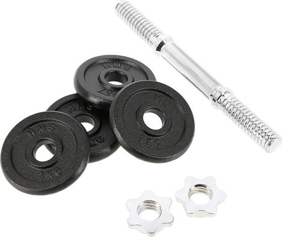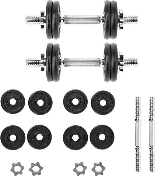 W skład zestawu wchodzą: 2x gryf prosty, 4 talerze 1 kg, 4 talerze 1,25 kg oraz 4 zaciski gwiazdowe.