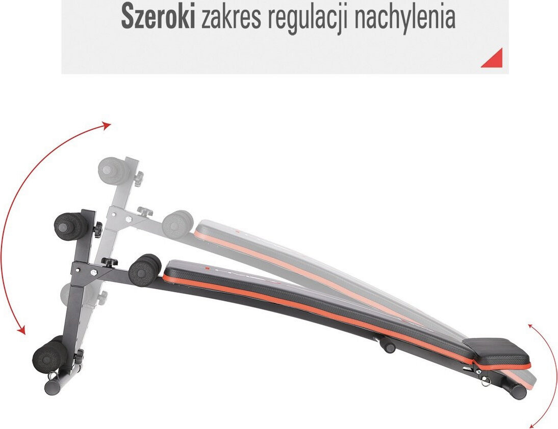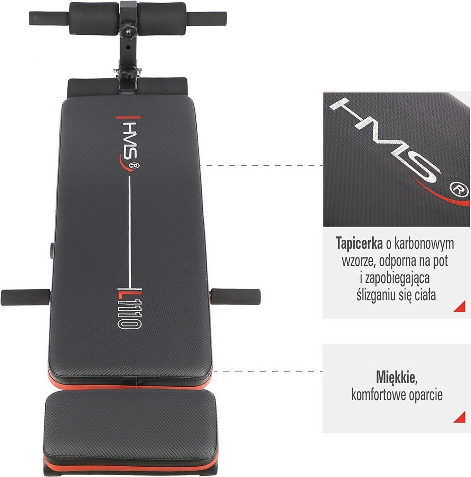 Ławka L1110 HMS, to nie tylko stabilność, ale i wygoda. Miękka gąbka na oparciu oraz gąbki na podpórkach na stopy, gwarantują komfort ćwiczeń przez cały czas ich trwania. Tapicerka o karbonowym wzorze jest nie tylko stylowa, ale również odporna na pot i zapobiega ślizganiu się ciała podczas ćwiczeń. Regulacja poziomu nachylenia, pozwala w prosty sposób dostosować trudność ćwiczenia do swoich potrzeb. Im większe nachylenie, tym bardziej zaawansowane ćwiczenie. W zestawie z ławką znajdują się również gumy oporowe, które łatwo i szybko zaczepia się w specjalnie przeznaczonym do tego miejscu. Gumy urozmaicą trening i zapewnią duży wachlarz możliwych do wykonania ćwiczeń.