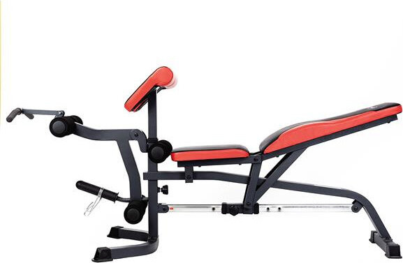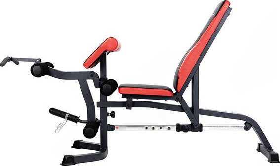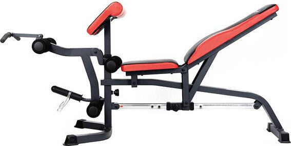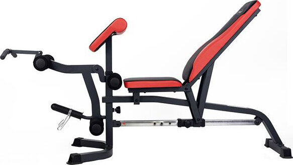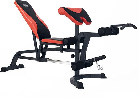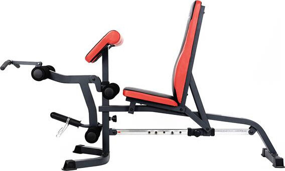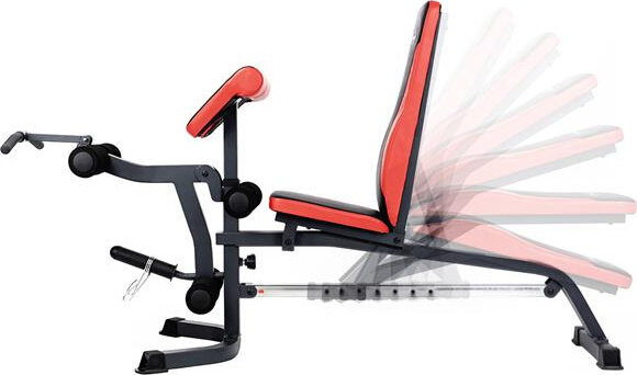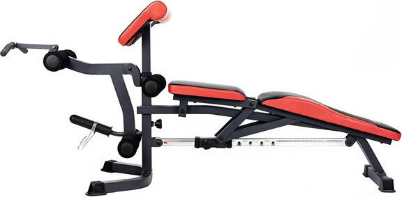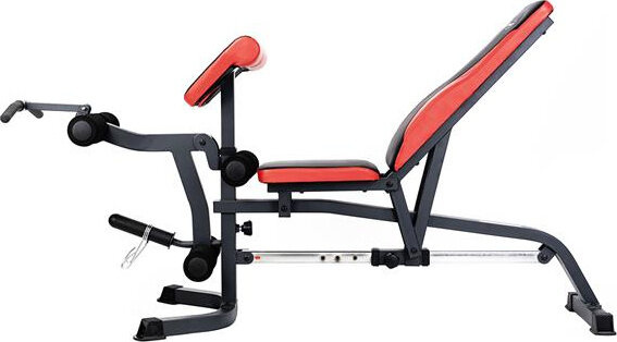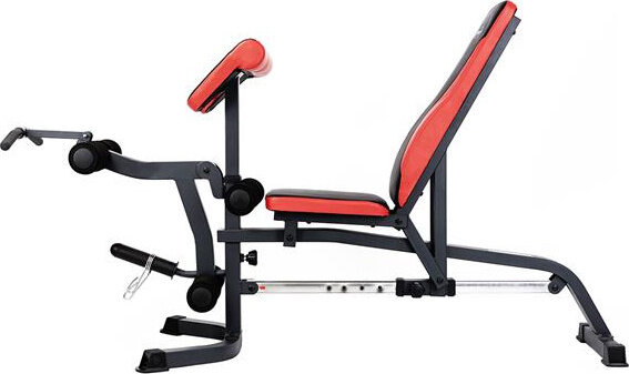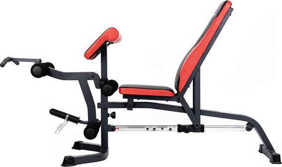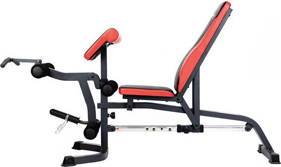 Szeroki wachlarz możliwości ławki uzupełniają stacja do ćwiczeń bicepsów oraz prasa do nóg.