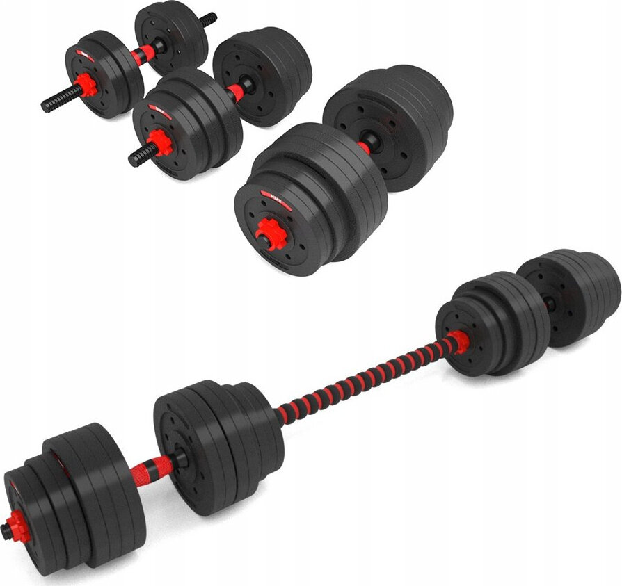W skład zestawu wchodzą dwa gryfy, cztery zaciski, łączenie dwóch gryfów i łącznie 16 talerzy obciążeniowych.
