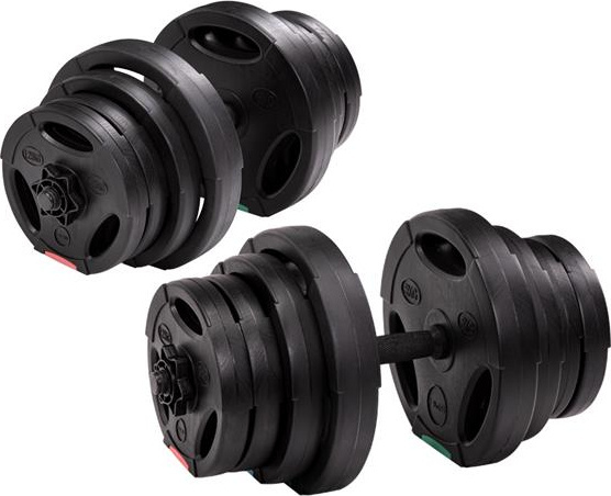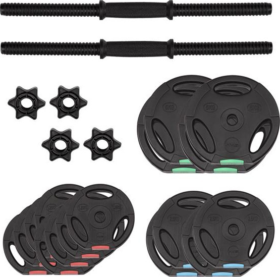 W skład zestawu wchodzą dwa gryfy, cztery zaciski i łącznie 16 talerzy obciążeniowych.