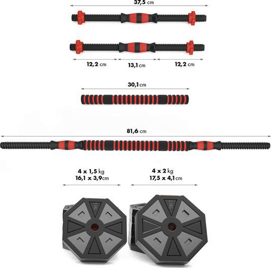W skład zestawu wchodzą dwa gryfy, cztery zaciski, łączenie dwóch gryfów i łącznie 8 talerzy obciążeniowych.