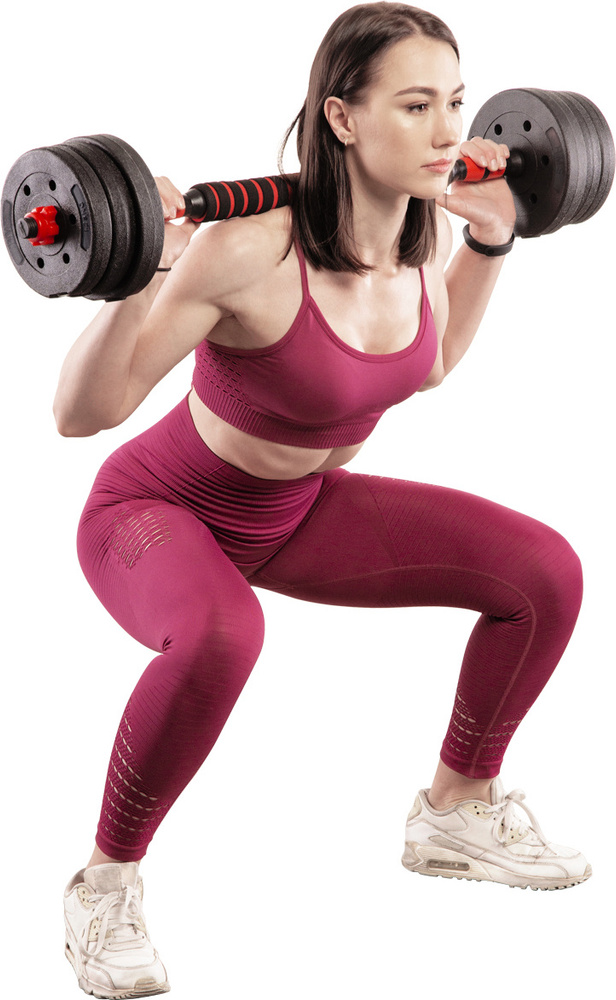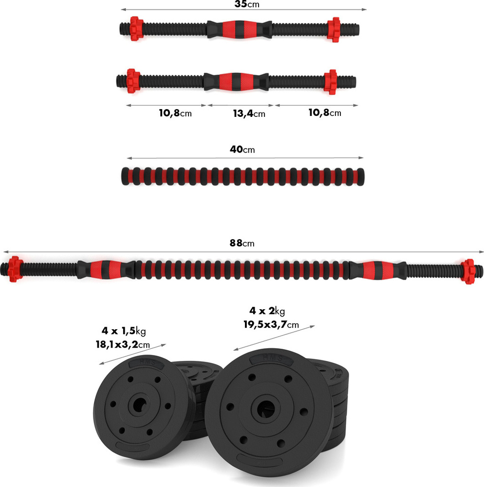 W skład zestawu wchodzą dwa gryfy, cztery zaciski, łączenie dwóch gryfów i łącznie 8 talerzy obciążeniowych.