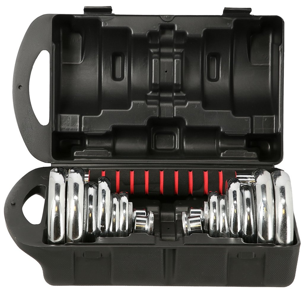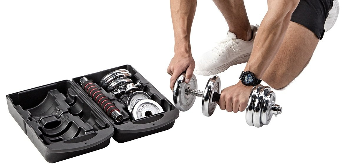 STC21 HMS, zestaw chromowanych sztangielek w walizce, z funkcją sztangi.