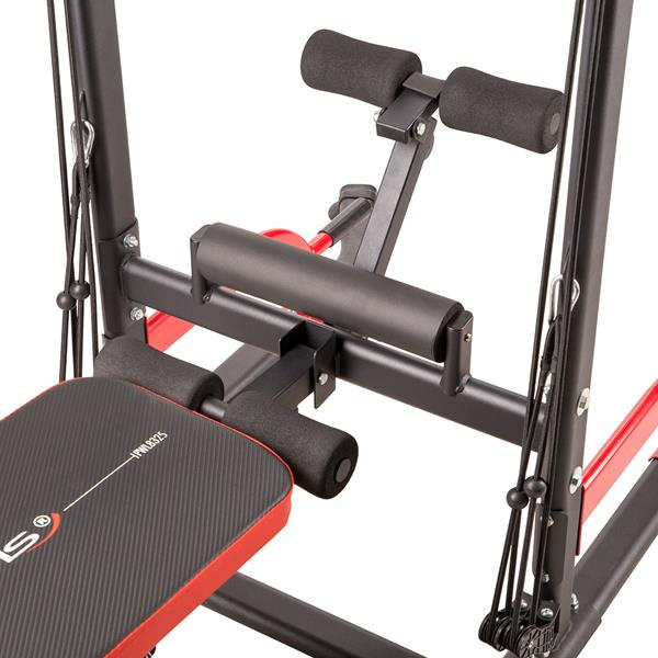 Użytkownik ma do dyspozycji drążek, poręcze do tzw. dipów, ławeczkę, podpórki do pompek, a także haki na których można umieścić sztangę.