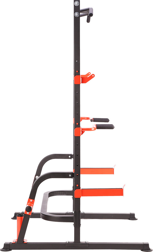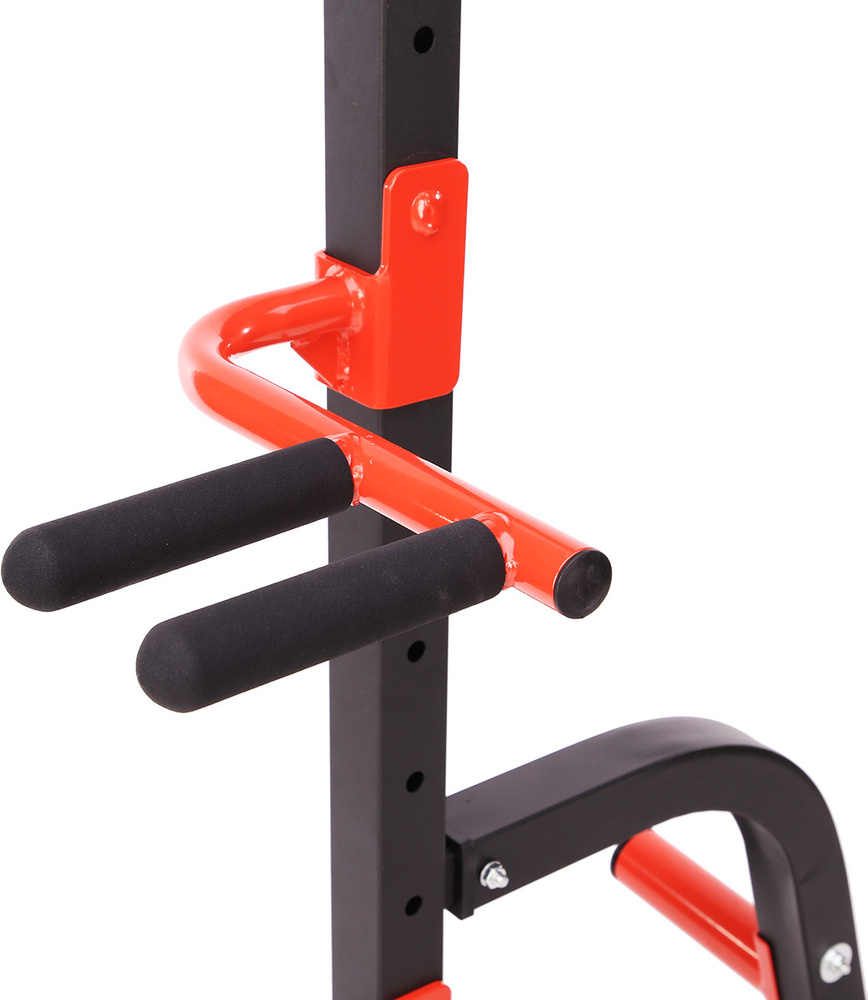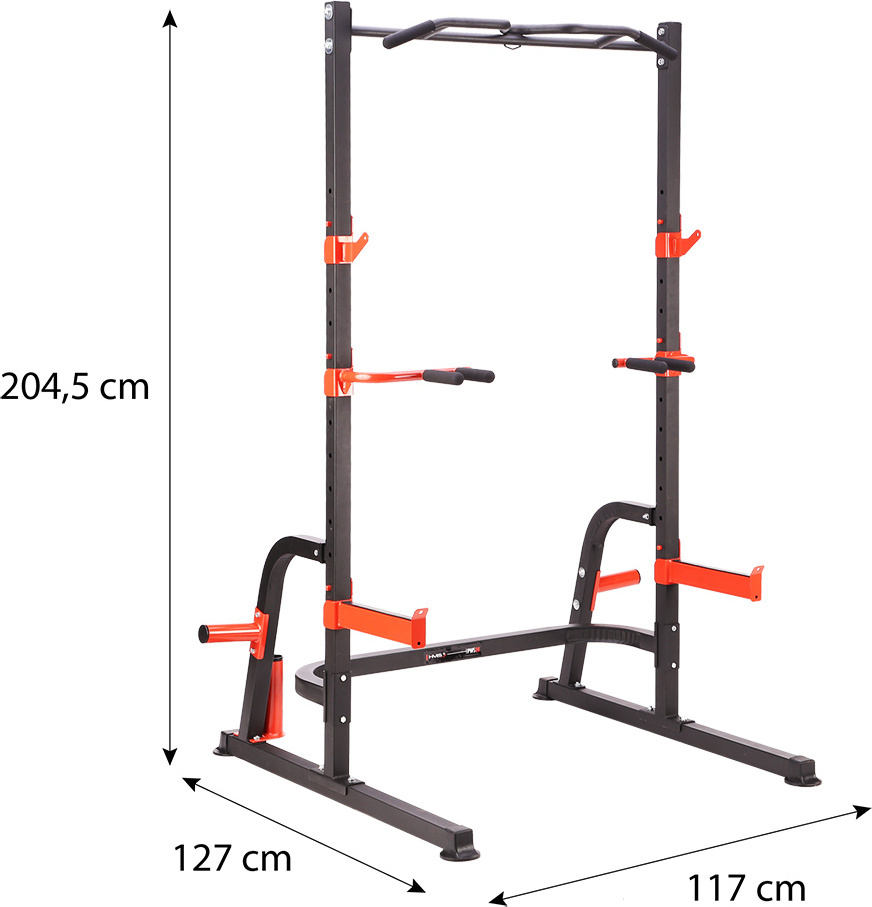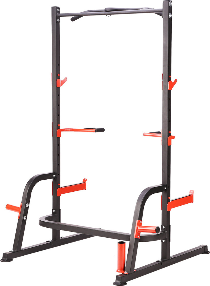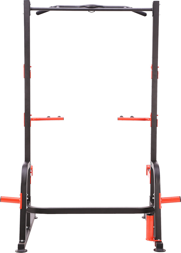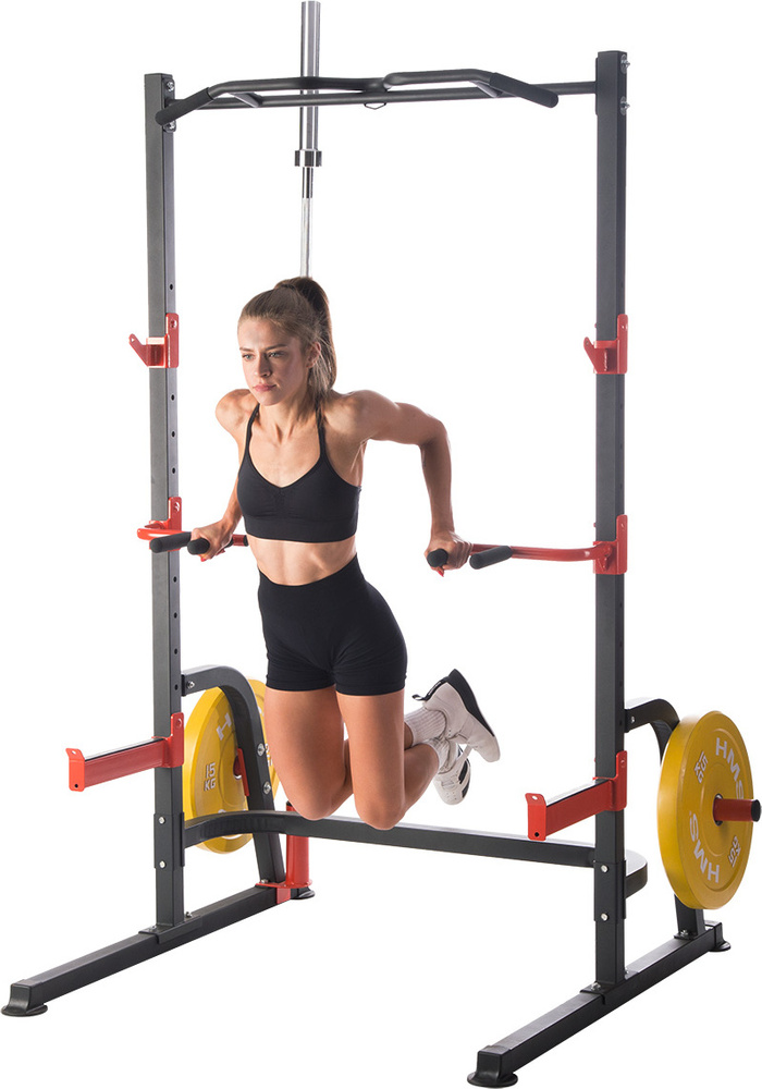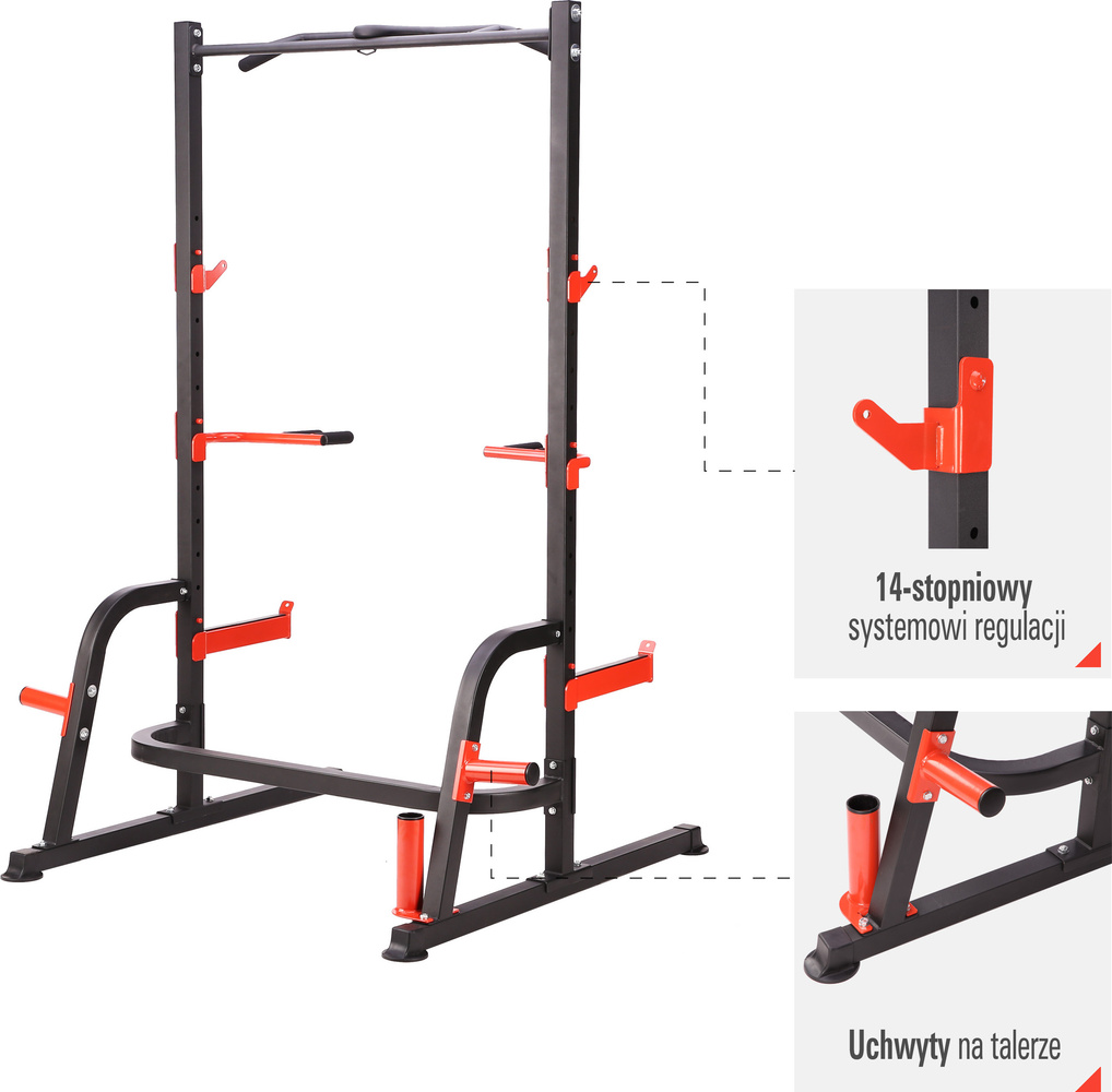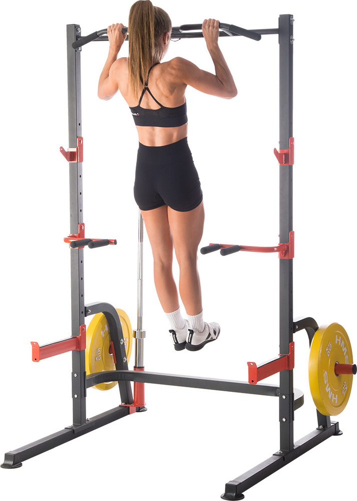 Stojak został wyposażony w uchwyt na sztangę oraz haki do asekuracji, dzięki którym możesz bezpiecznie i samodzielnie wykonywać trening siłowy z dodatkowym obciążeniem , z kolei drążek i poręcze można wykorzystać do treningu kalenistycznego , czyli wykorzystującego ciężar własnego ciała.