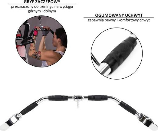 W najszerszych miejscach rękojeści ustawione są pod kątem, co przy ćwiczeniu ściągania drążka na wyciągu górnym sprzyja przyciąganiu łokci do tułowia, czyli utrzymaniu lepszej techniki ćwiczenia.