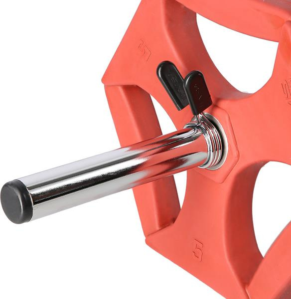 Dzięki sprężynowej konstrukcji oraz polipropylenowym nakładkom na "skrzydełka", zacisk można łatwo ścisnąć i dosunąć wzdłuż gryfu aż do obciążeń, zapewniając, że talerze pozostaną na swoim miejscu nawet podczas dynamicznych ćwiczeń.
