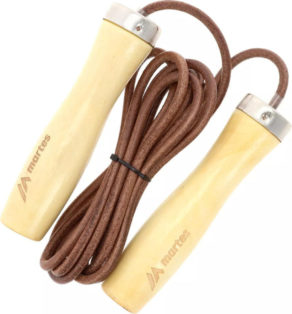 Skakanka skipo marki martes posiada drewniane uchwyty, które dobrze leżą w dłoni oraz skórzaną linką.
